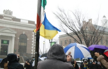 The Ukrainian flag was hoisted into the wind-whipped, sleet-filled sky above the Middlesex County Administration Building and Middlesex County Courthouse on Saturday morning.